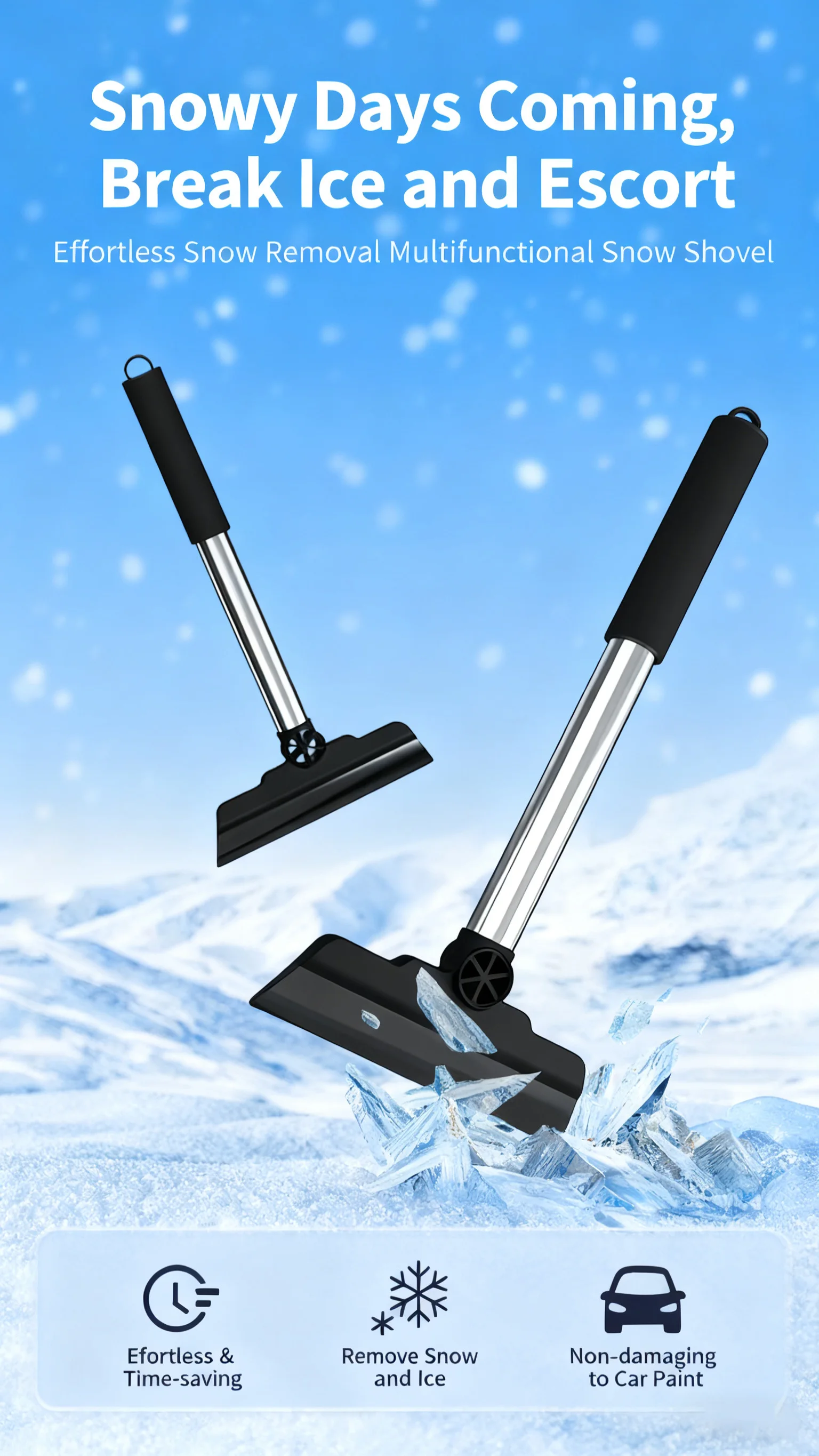 1.Hold the handle of the frost shovel tightly so that the shovel head is close to the windshield.