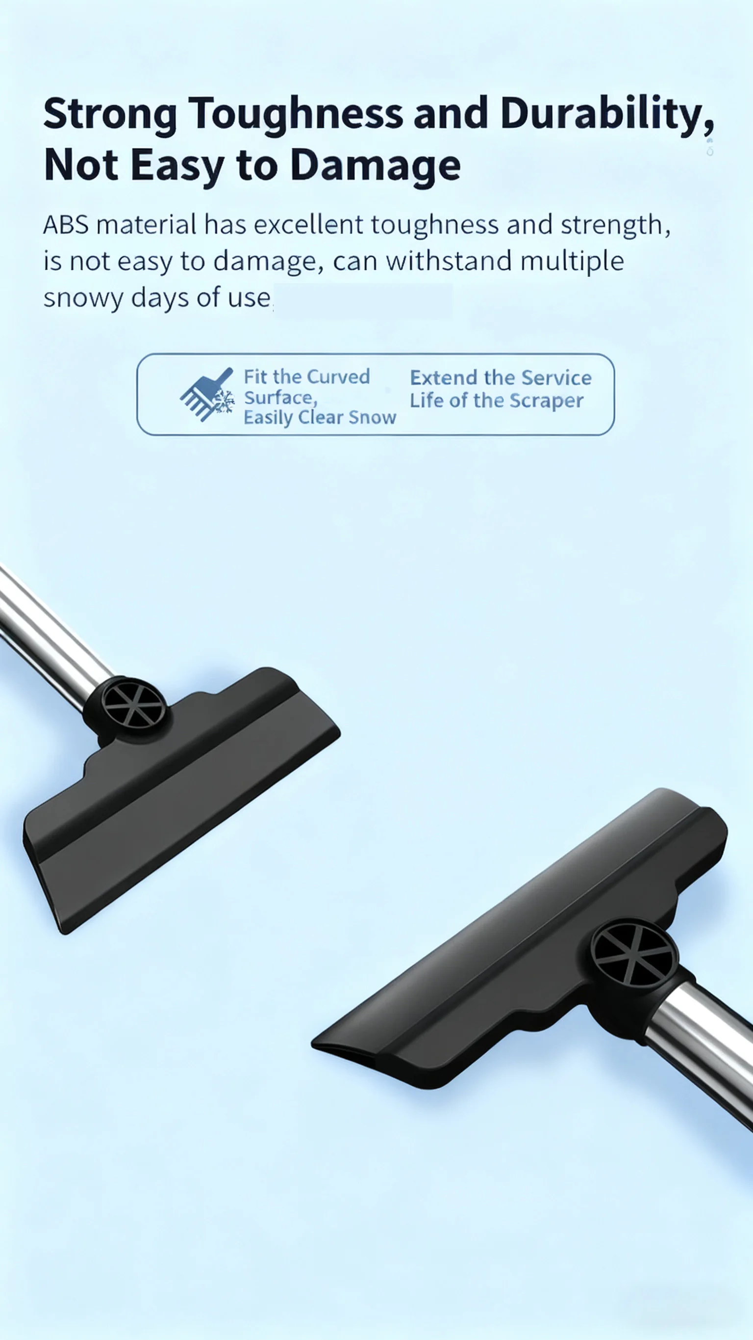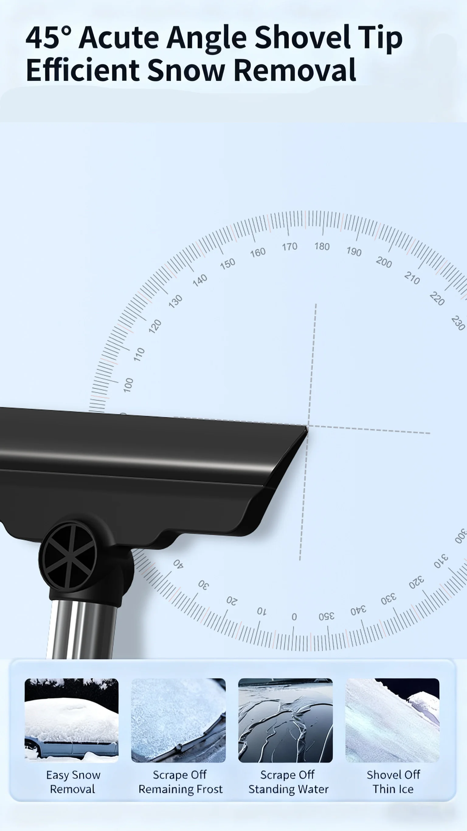 1.shovel head: produced with cold-resistant ABS raw materials, the sharp ice shovel groove is suitable for deicing thicker windows.